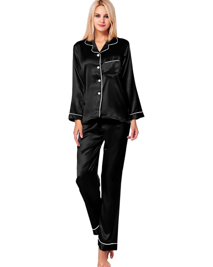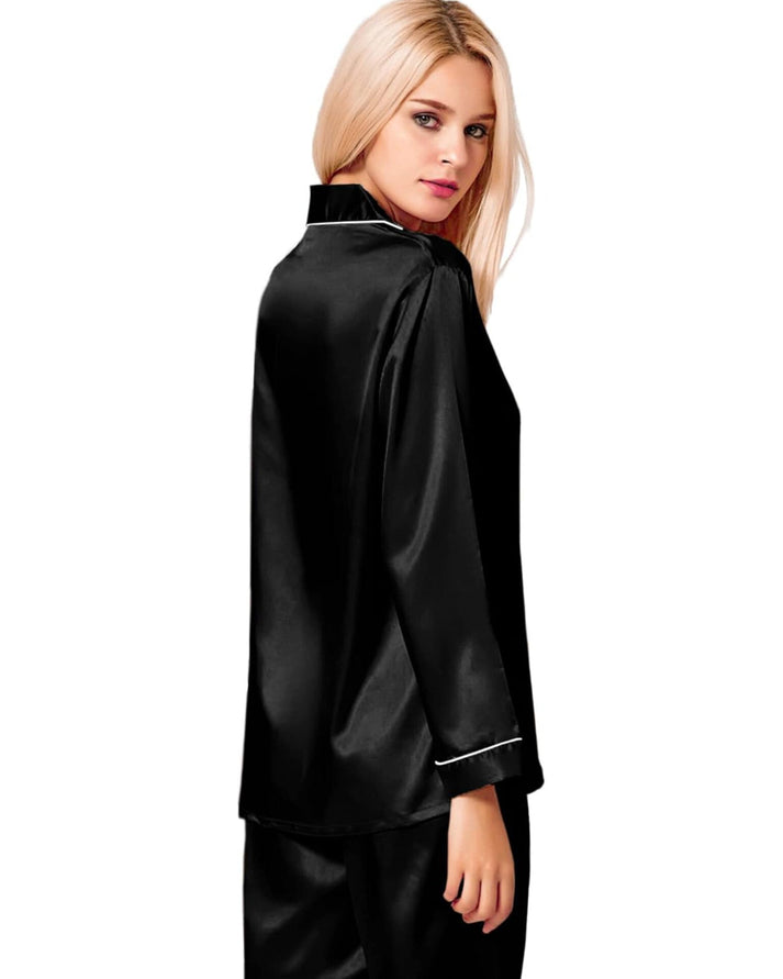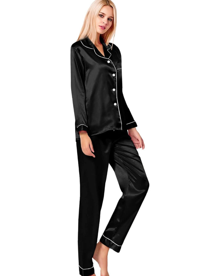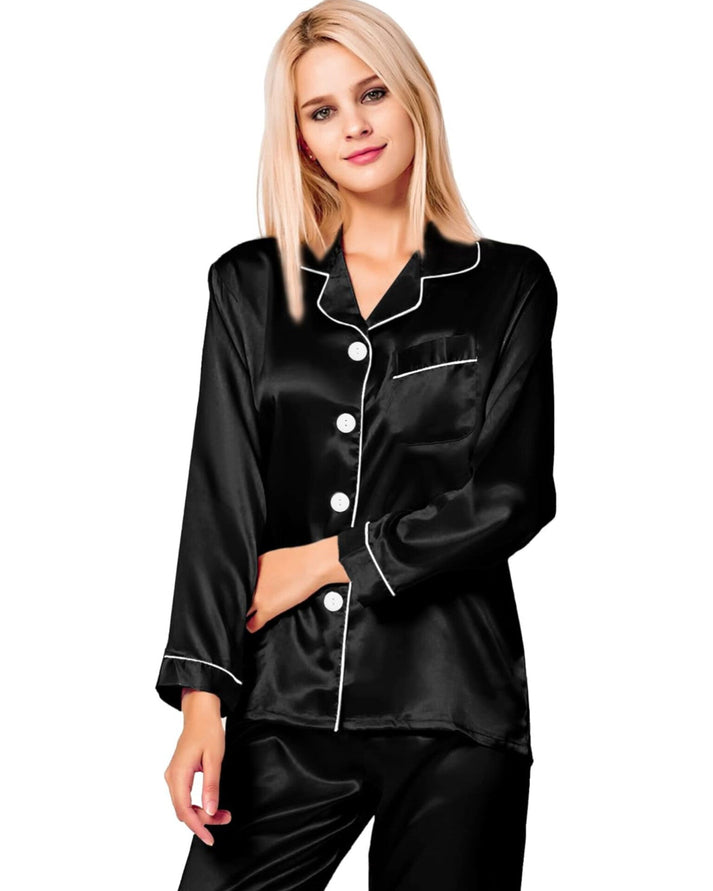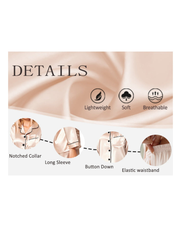 A signature SilkDreamz nightsuit/pajamas set, Satin Silk is responsibly crafted using a unique weaving technique that creates a smooth pearl-like gloss luster on one side of the fabric, while the reverse has a matte finish. This distinctive pattern adds an ultimate soft touch to any outfit or home decor. Breathable, hypoallergenic, moisture-retaining, drapes well, and endures throughout the seasons.